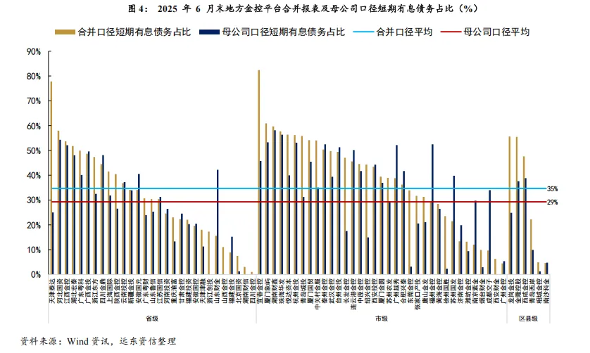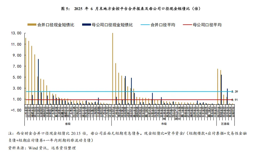 从短期偿债能力来看,地方金控合并口径现金短债比强于母公司口径,且边际上有所改善;平台间分化较为显著。整体上看,2025年6月末,地方金控合并口径和母公司口径现金短债比(整体法计算)分别为1.0倍和0.39倍。由于子公司层面资金通常较为充裕,合并口径对短期有息债务的覆盖能力明显更强。从边际变化看,母公司口径现金短债比较2024年末小幅回升,其中省级平台改善较为明显;合并口径虽较2024年整体维持稳定,但仍有超过半数的企业实现改善。具体到各平台,短期偿债能力分化显著。部分金控两个口径现金短债比均大于1倍,流动性较为充裕,包括省级平台中的福建金投、北京国资、安徽国控等7家,地市级平台中的广州金控、徐州国胜等5家,以及区县级平台中的相城金控、龙岗金投。与此同时,也有部分平台两个口径现金短债比均不足1倍,短期偿债压力相对突出,涉及省级平台中的广东粤科、四川金鼎等13家,地市级平台中的珠海华发、济南金控等20家,以及区县级平台中的青岛西岸、金隆控股。