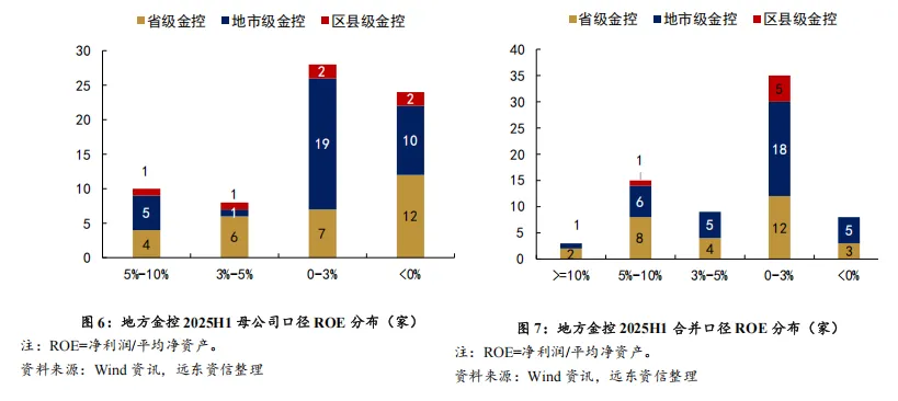 整体而言,一方面,行业层面呈现“收入弱修复、利润仍下行”的弱复苏态势;另一方面,合并与母公司口径的显著差异及ROE分层分布,进一步凸显了“子强母弱”的结构性特征和内部信用分化:头部省级与强市级平台依托牌照与股权投资仍能维持相对可观的集团盈利,而大量中小、弱区域平台则在投资回撤、息差收窄与减值压力下盈利趋弱甚至亏损。