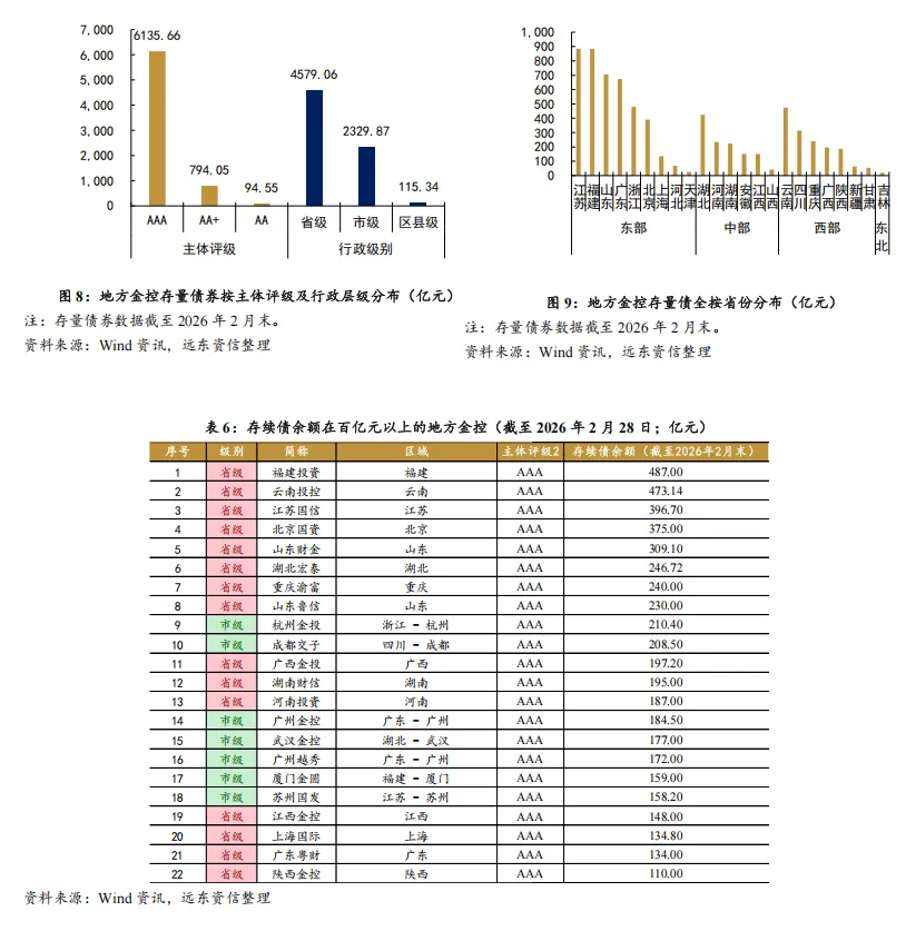 地方金控存量债券规模已超7000亿元,发行主体集中于省级和地市级平台,且以AAA高等级主体为主。截至2026年2月28日,样本金控存续债券余额合计7024.26亿元,其中省级金控、地市级金控分别发行4579.06亿元和2329.87亿元;AAA级主体发行规模达6135.66亿元,占比87.35%,高信用等级主体为发行主力。