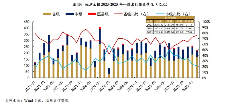发行规模方面,总量稳中微降,地市级占比略有提升。 2023-2025年,地方金控发行规模分别为2945.52亿元、2922.40亿元和2903.49亿元,呈小幅收缩趋势。分层级看,省级金控发行量从2147.30亿元降至1872.80亿元,占比由72.9%降至64.5%;地市级金控发行量则从767.08亿元增至992.85亿元,占比由26.0%提升至34.2%;区县级发行规模较小且波动较大。从月度数据来看,地方金控债券发行规模基本稳定在200-300亿元区间。上半年地市级平台融资表现较为活跃,发行占比逐月提升,并于6月首次超过省级平台;进入下半年后,地市级发行节奏有所放缓,省级平台发行量回升并重新占据主导地位。从全年累计看,省级金控仍是发行主力。