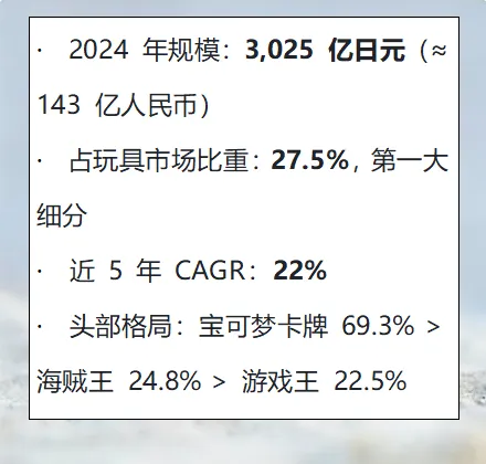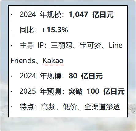 日本是全球最成熟、IP 最密集、成人化最深的潮玩市场,少子化背景下连续 5 年增长,2024 年创历史新高,2026 年维持高景气,是中国品牌出海与合作的黄金标杆。