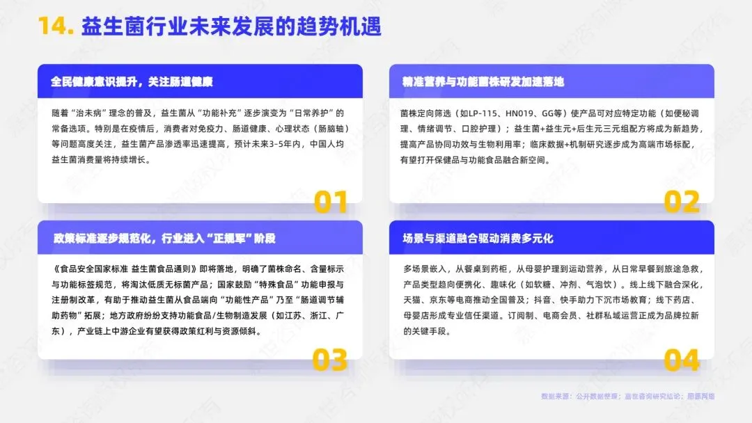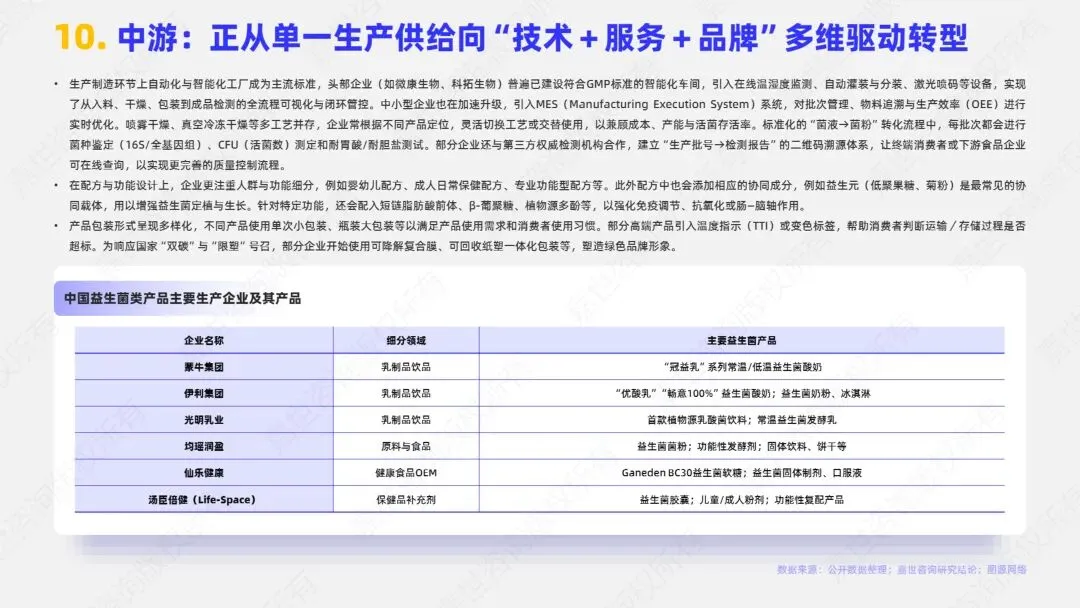 益生菌行业产业上游提供原料供应与技术研发,包括菌株资源与筛选、发酵工艺与技术平台、原料检测与质量控制等环节。中游则负责生产加工与配方开发,包括益生菌产品的生产制造、配方与功能设计、产品的包装设计与品牌定位等。下游为渠道分销与终端应用,包括各类销售渠道、各种终端应用场景及各类增值服务。