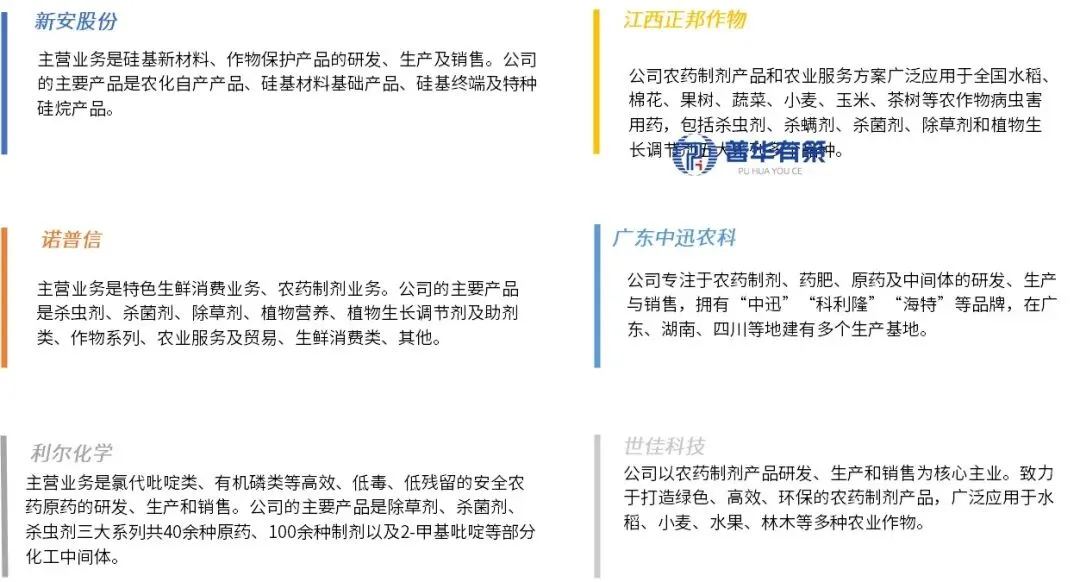 行业内企业主要有新安股份、诺普信、利尔化学、江西正邦作物、广东中迅农科、世佳科技等。