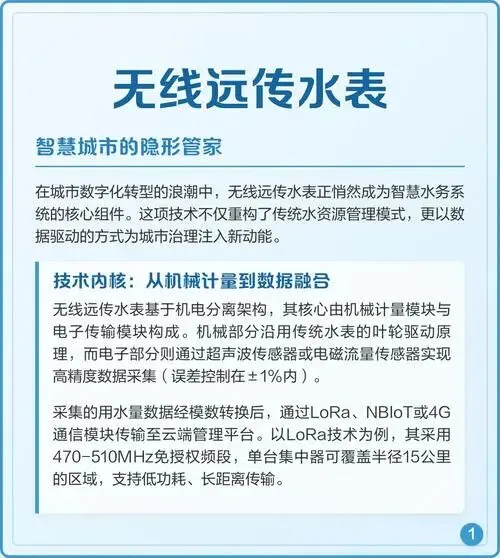 从行业格局看,像宁波系、部分浙江和华东企业,是从机械表、电子表迭代过来,再叠加LoRa、NB-IoT等通信模块,优势是生产体系成熟、标准齐全、在市政项目上积累深。另一拨玩家本身就是智慧水务或智慧能源解决方案商,LoRa水表只是整套监控平台的一环,他们更强调端到端打包:从现场表计到云平台,再到数据分析和运维工具。还有厂家干脆把精力集中在超声计量、无磁结构、远距通信等技术点上,做成可选通信方式的“模块化水表”,LoRa、NB-IoT、M‑Bus随项目切换。这种分工背后的机制,其实就是“谁更懂哪一环”:传统水表厂更懂计量和工程条件,平台型企业更懂数据流转和业务流程,专精技术厂看重测量精度和全生命周期成本。但误区之一,是很多采购方以为“谁家功能多就谁更先进”,堆了太多不一定用得上的功能,反而增加维护复杂度;误区之二,是盲目追逐最新通信名词,却忽略了本地网络环境和运维团队能力。? ## 性能怎么理解:不止是“抄得上来”