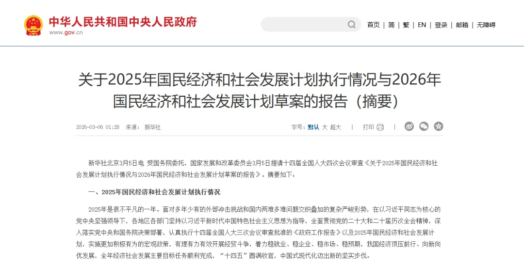 3月6日,新华社发布了《关于2025年国民经济和社会发展计划执行情况与2026年国民经济和社会发展计划草案的报告》(摘要)。