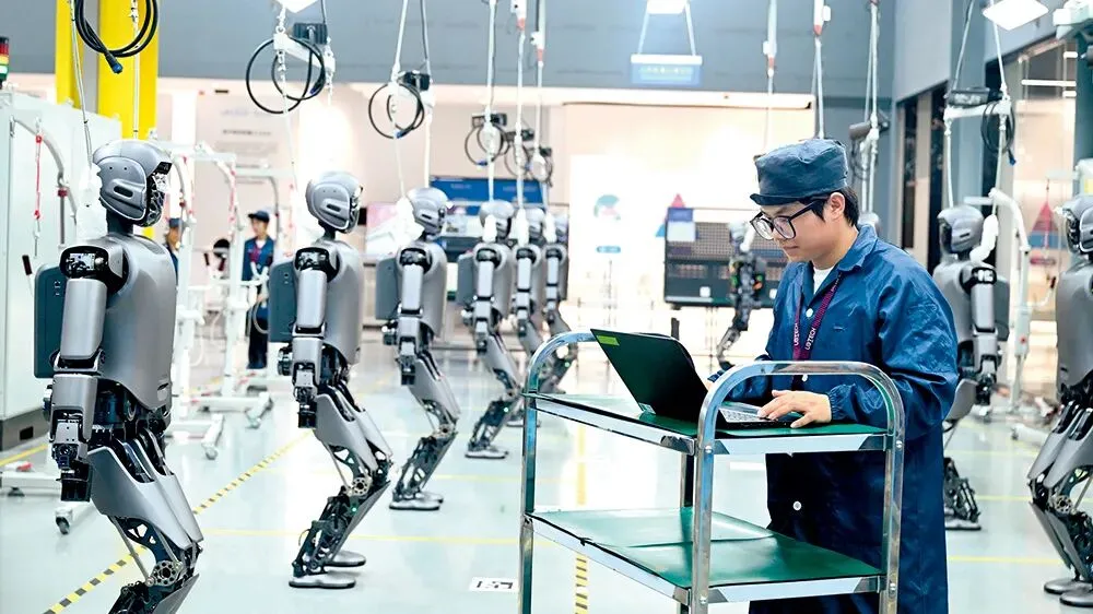 广西柳州市北部生态新区机器人产业园工人正在检查即将下线的工业版人形机器人 图源:新华社