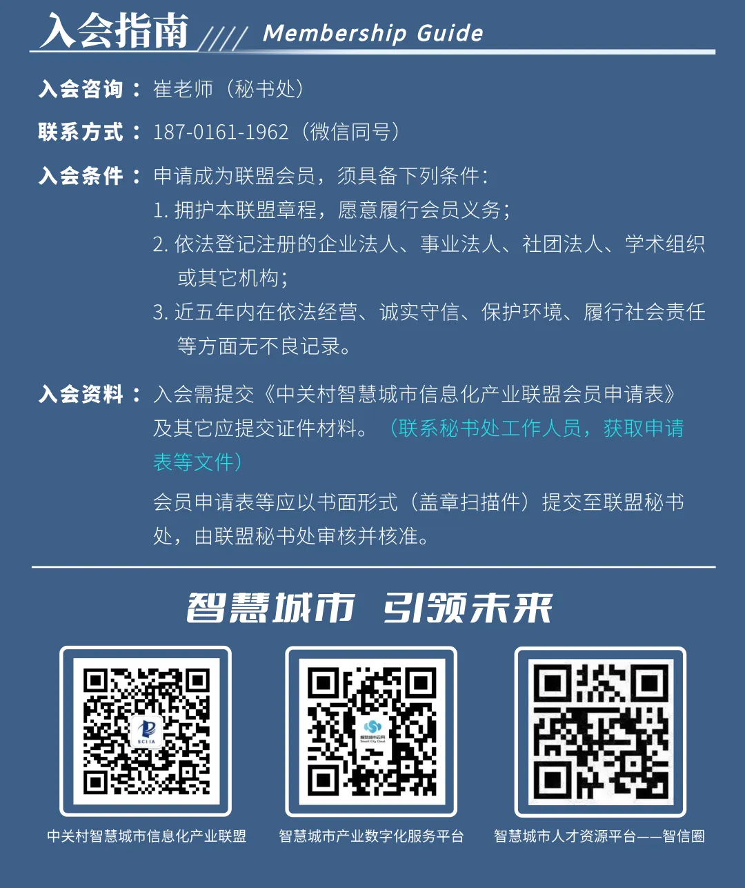 中关村智慧城市信息化产业联盟(ZhongGuanCun Smarter City Information Industry Alliance ,简称SCIIA)是成立于2015年,具有独立法人资格活动地域为全国的4A级社会组织,现有成员单位涵盖国内外智慧城市领域科研、制备、应用、检测和服务等方面的知名机构、大学、企事业单位。