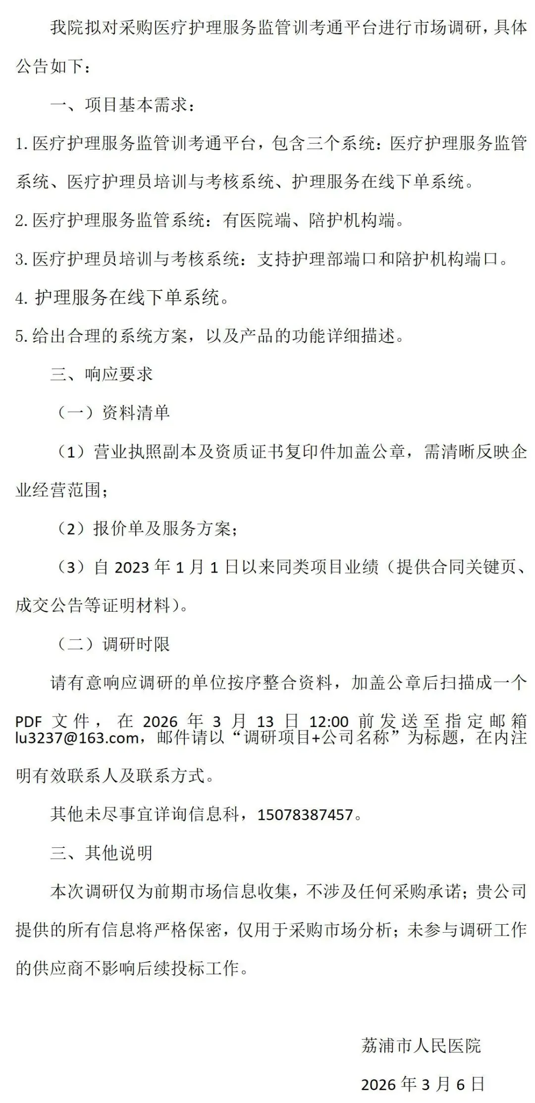 荔浦市人民医院医疗护理服务监管训考通平台市场调研公告