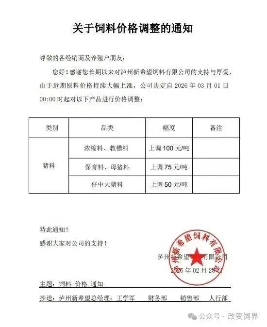 饲料涨价已启动:受成本传导,铁骑力士、新希望、通威、国雄饲料、牧之元等饲料企业已于3月1日宣布上调饲料价格50-100元/吨。