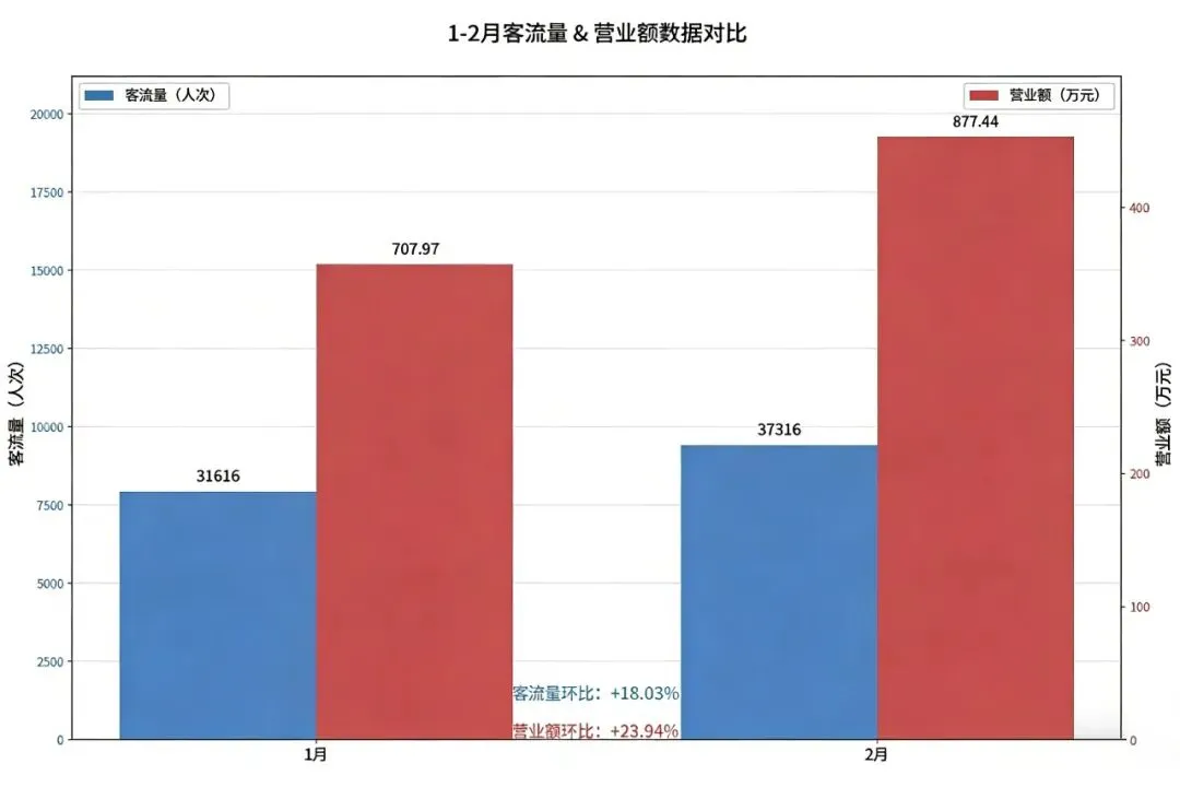 1月总客流量累计31616人次,2月总客流量累计37316人次,环比增长18.03%;1月总营业额累计707.97万元,2月总营业额累计877.44万元,环比增长23.94%。