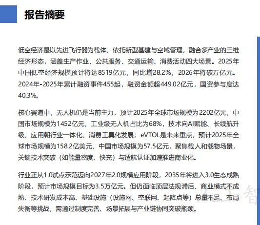 低空经济的本质是传统二维地面经济活动向三维立体商业空间的转变,是实现经济增长从"平面经济"迈向"立体经济"的范式革命。2025年作为"动荡调整"的关键年份,既是1.0阶段的收官,也是2.0阶段的蓄力。在政策、资本、技术的三重驱动下,中国低空经济正穿越周期波动,向着2035年3.5万亿的生态成熟阶段稳步迈进。这一进程中,制度创新的勇气、技术突破的耐心、商业模式的巧思,将共同决定中国能否在全球低空经济版图中占据引领地位。