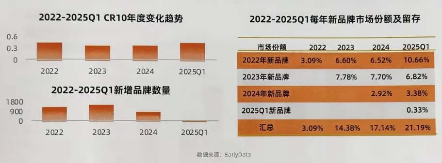 从市场竞争格局来看,益生菌市场集中度逐步提升,2025年第一季度CR10市场份额显著攀升至48.5%伴随市场竞争日趋激烈,新品牌入局门槛大幅提高,2025年第一季度新增品牌数量从前几年的千余家锐减至113家。同时,新品牌淘汰率居高不下,2022年新品牌当年市场份额为3.09%,而2025年第一季度新品牌市场份额仅为0.33%。不过,留存品牌则展现出强劲的增长韧性,2022年入局的新品牌市场份额逐年走高,从3.09%稳步攀升至2025 年第一季度的10.66%。