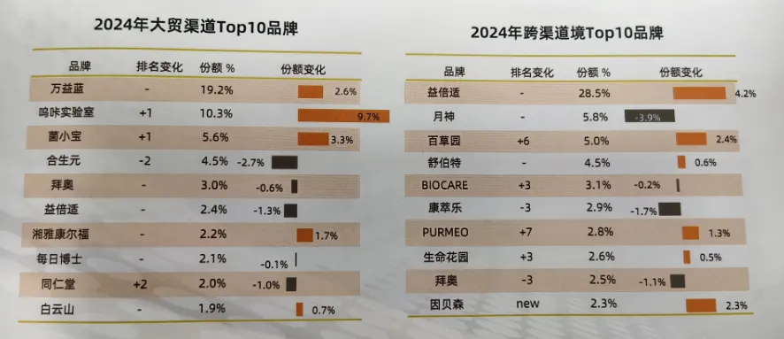 聚焦品牌间竞争,2024年国内大贸渠道益生菌头部品牌格局基本稳定,六成品牌排名保持不变。其中万益蓝以19.2%的份额居首位。在份额排名变化的品牌中,呜咔实验室排名上升1位,合生元等部分品牌则份额下滑。跨境渠道方面,益倍适以28.5%的绝对优势一马当先。女性益生菌品牌表现两极化生命花园与结合传统中医药的新品牌因贝森份额上涨,而月神遭遇滑铁卢,品牌份额下滑。整体来看跨境市场洗牌加速,本土化创新能力成为关键胜负手。