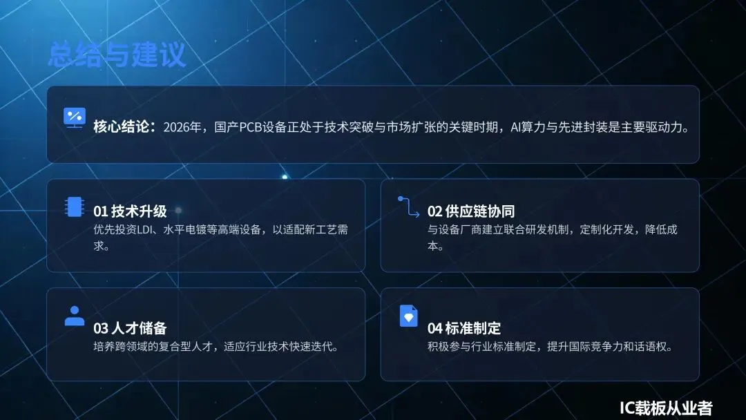 根据中国电子专用设备工业协会预测,到 2026 年,中国 PCB 设备高端国产化率有望提升至65% 以上,行业将构建起覆盖全制程、具备全球竞争力的高端装备体系(89)。这一趋势的背后,是国产设备企业在技术创新、产品性能、成本控制等方面的全面突破。