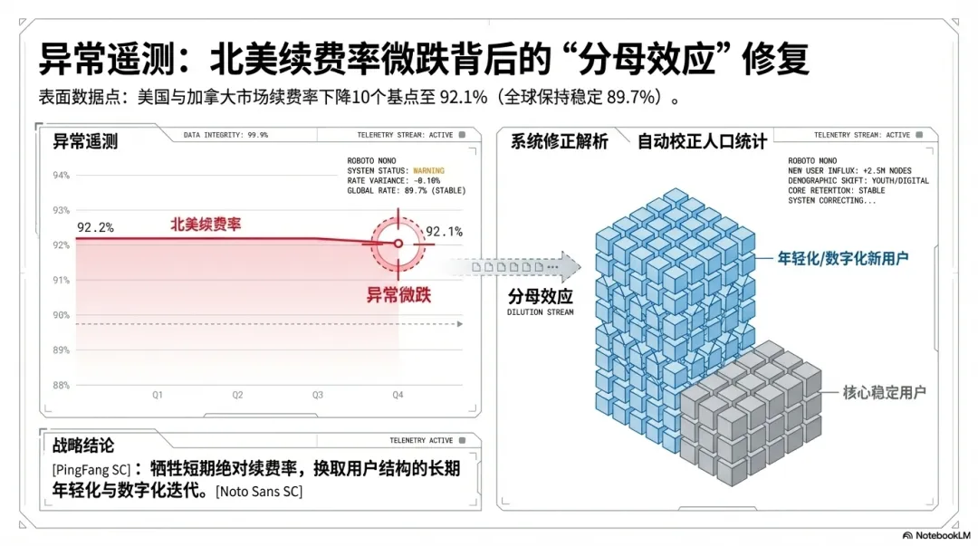 但就在这个季度,美国和加拿大市场的续费率却微跌了10个基点,降到了92.1%。虽然全球整体续费率依然稳定在89.7%,但考虑到北美是它最核心的大本营,这个数字乍一看,的确会让人产生一丝担忧。