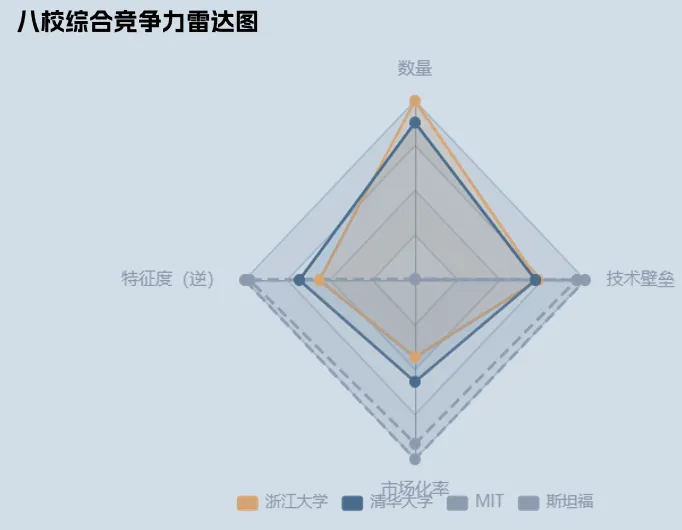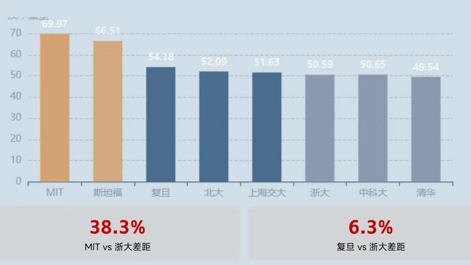 国际差距:MIT技术壁垒比浙大高38.3%,斯坦福高31.5%,反映国际顶尖高校更强的技术创新能力。