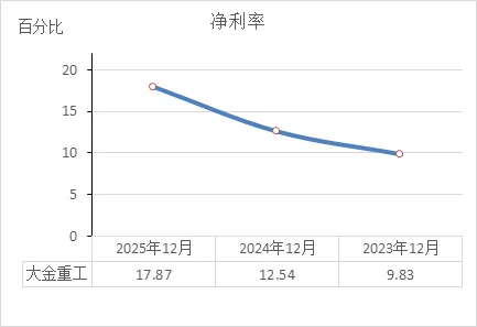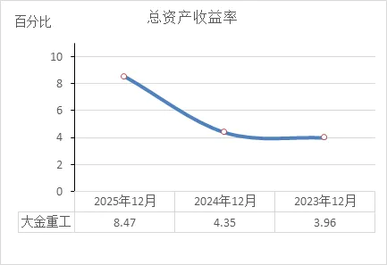 这说明:负债率在逐年上升,但始终低于50%。在制造业里,通常认为资产负债率40%-60%是合理区间,超过70%才需要警惕。大金重工目前仍处于偏低水平。