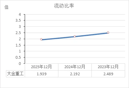 1.94倍是什么水平:在制造业里,这个数字依然属于稳健区间。通常认为流动比率低于1才需要警惕(可能资不抵债),大金重工离警戒线还有很大距离。