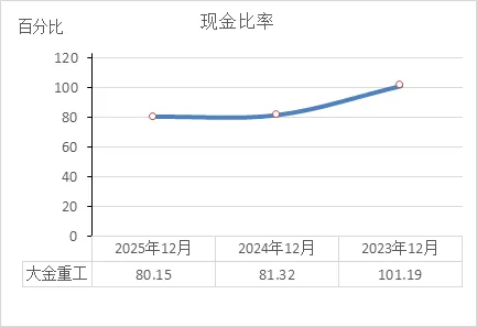 对比常识:通常企业不会保留太多现金,会拿去投资或扩大生产,所以20%-30%的现金比率已经算健康。大金重工保持在80%,说明: