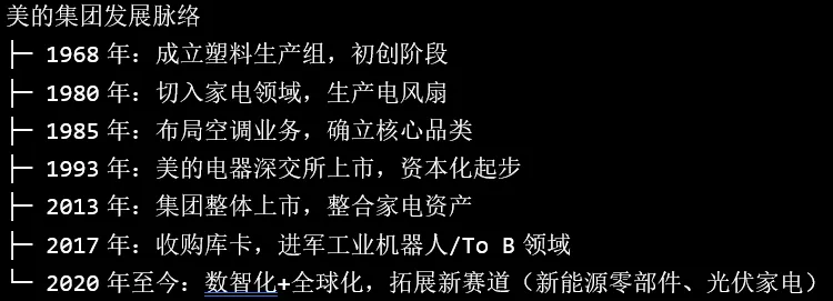 ·2020年至今:聚焦“数智化转型+全球化突破”,拆分楼宇科技、机器人业务板块,深化To C与To B协同,布局新能源汽车零部件、光伏家电等新赛道。