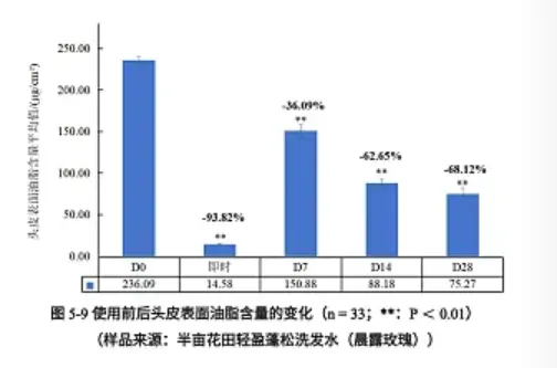 2.调节头皮脂质:在清洁策略上,花萃洗发水采用温和的表面活性剂,精准地带走老废油脂,同时保留有益脂质。配合百脉根提取物这一植萃成分,从源头调节油脂分泌,即时油脂减少93.82%,使用产品28天后,油脂减少68.12%,实现即时控油与长效养护的双重效果。