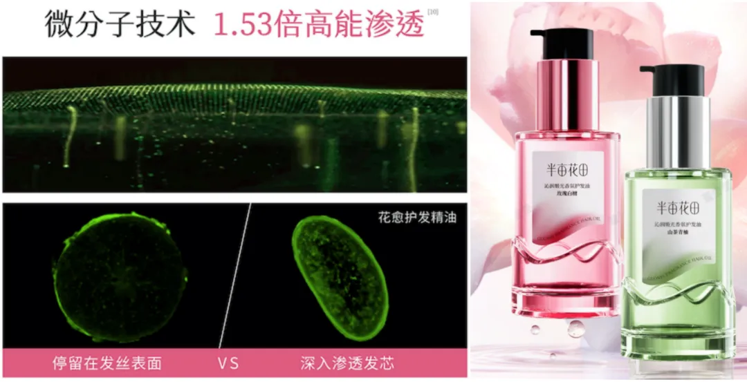 ②补充脂质与角蛋白:鲜花护发精油中多种鲜花籽油能补充流失的脂质,抚平毛鳞片。更关键的是,面对亚洲发丝“低渗透性”的难题,产品采用了微分子蛋白,实现了高达1.53倍的渗透修护,实现从内部填充受损的空洞。