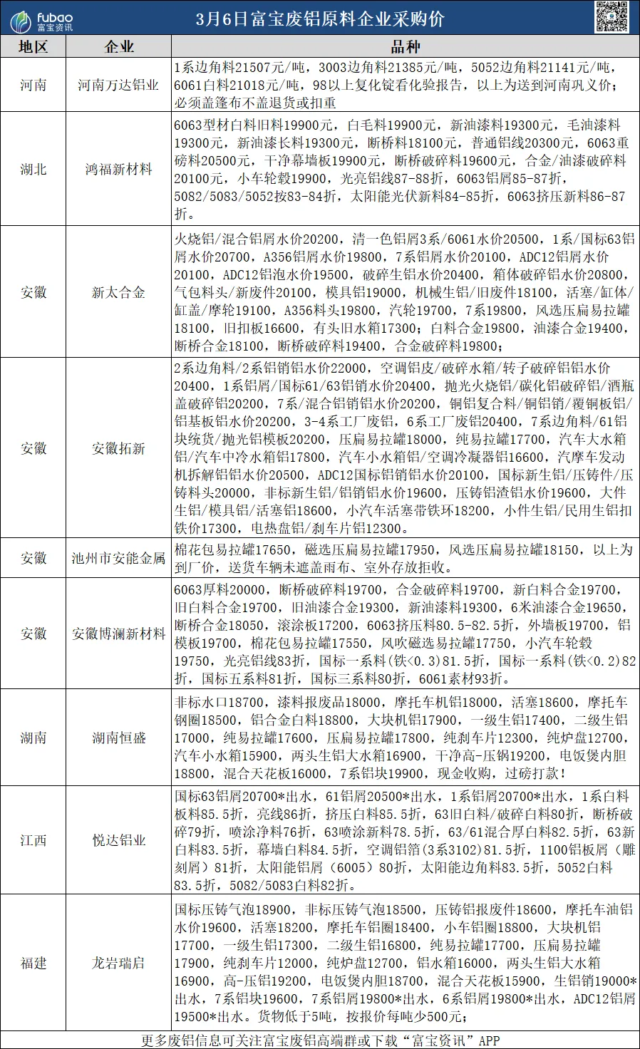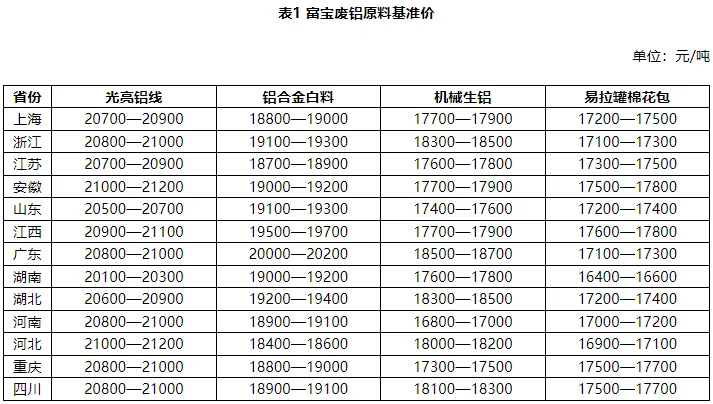 今各地区废铝价跌200-400元/吨不等,华东地区光亮铝线20600-21200元/吨,铝合金白料18700-20000元/吨,价格转跌,市场询价热度较高,部分持货商担忧价格继续下行,保持出货态度,成交一般。预计明日废铝价格或止跌回稳。