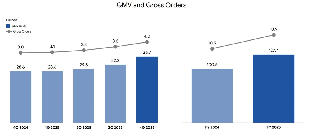 Sea财报显示,Shopee在2025年第四季度再创历史新高,总订单量达 40 亿单,同比增长30.5%;商品交易总额(GMV)达 367 亿美元,同比增长28.6%,证明了Shopee在东南亚电商市场的用户活跃度与交易规模持续扩张。
