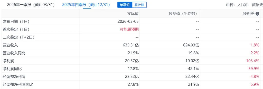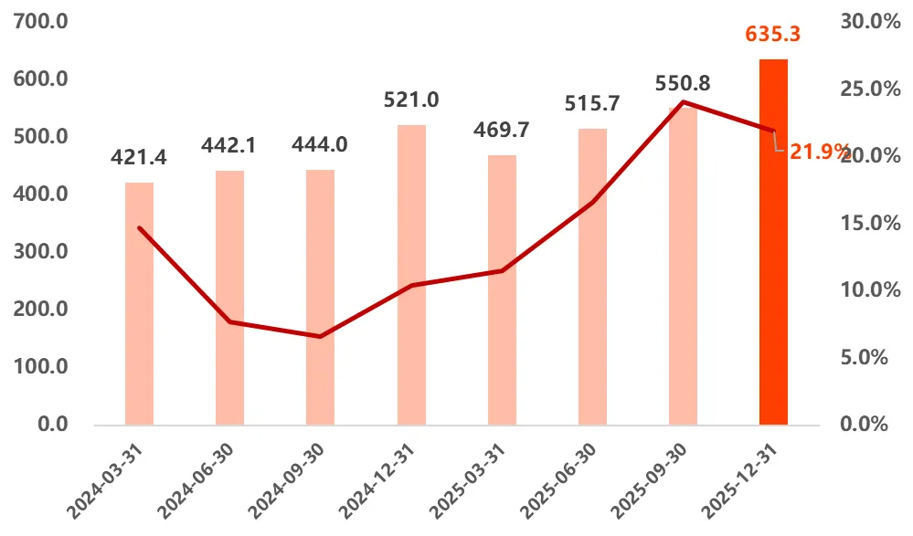 2025年第四季度,公司实现营收635.31亿元,同比增长21.9%,超出市场预期1.8%。