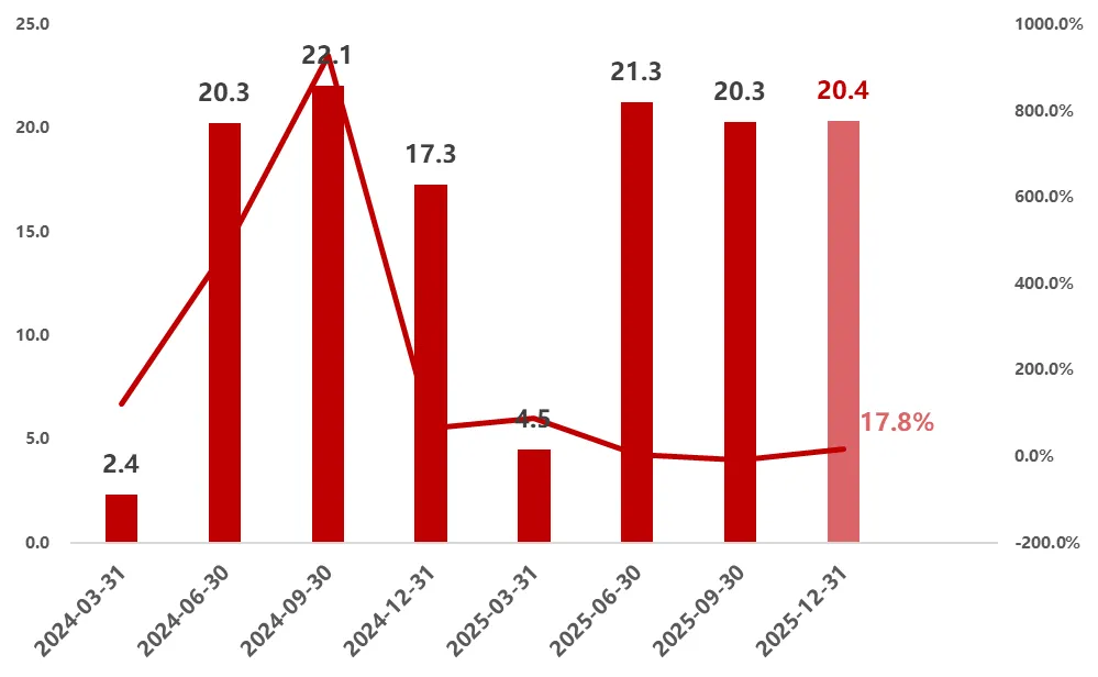单季净利润20.37亿元,同比+17.8%,大幅超出市场预期103.4%。