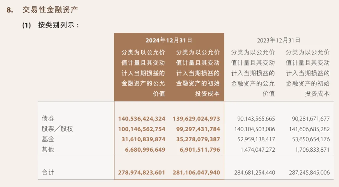 “其他”从530亿降至67亿,降幅巨大。可能的原因包括:清理信托产品、资管计划等非标资产;衍生品持仓到期或平仓;会计重分类(如将部分资产重新归类到其他科目)。最终还是要结合附注中的明细来判断。