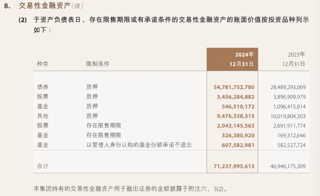 限售 | 约23.7亿 | 股票(20.4亿)为主 | 这部分是IPO/定增跟投形成的,反映了投行业务的活跃度。如果限售股占比过高,且股市下跌,可能带来较大浮亏。 | 债券质押规模翻倍,印证了前面“债券配置增加、加杠杆”的判断。可能是在利率下行周期中,中金将增持的债券质押出去,融入资金再投资。 |