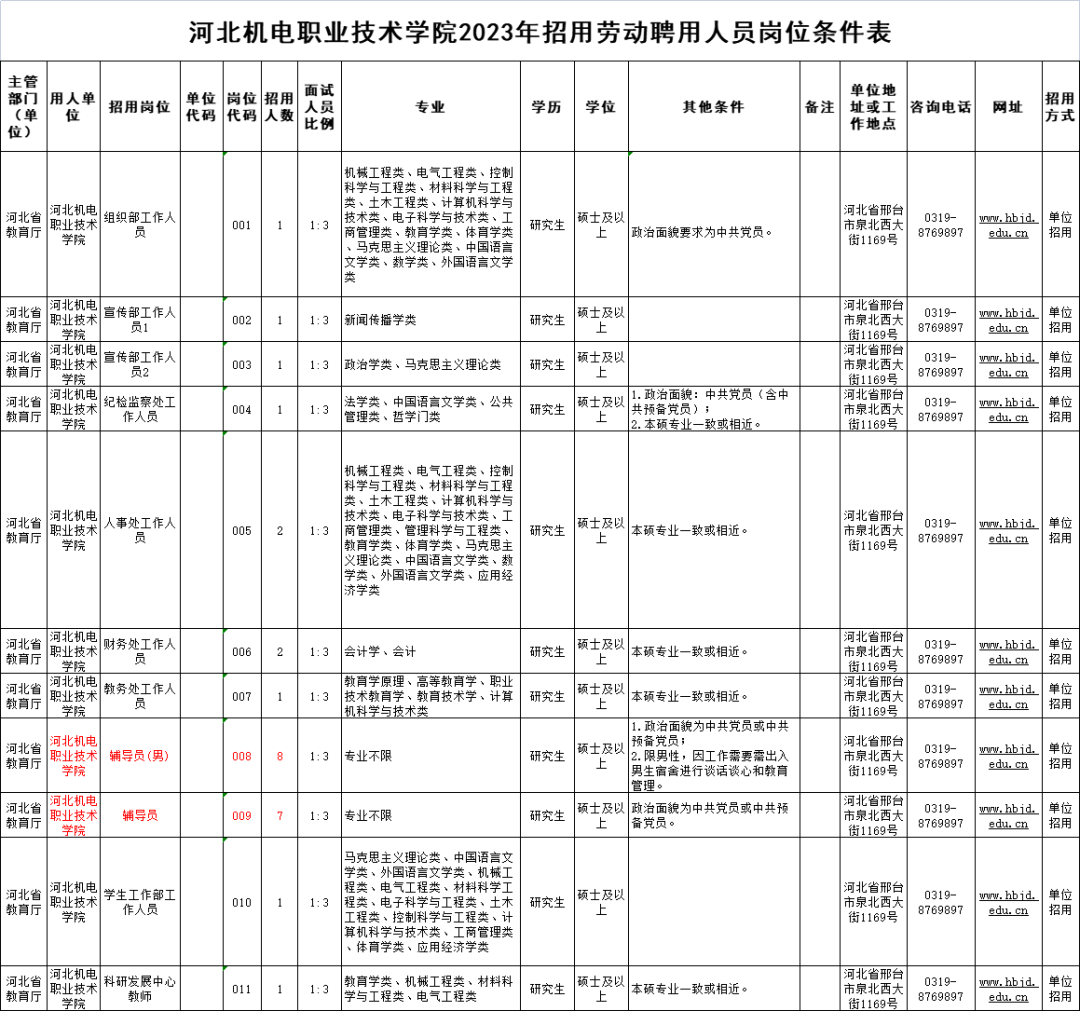 附件:1.河北机电职业技术学院2023年招用劳动聘用人员(第二批)岗位条件表
