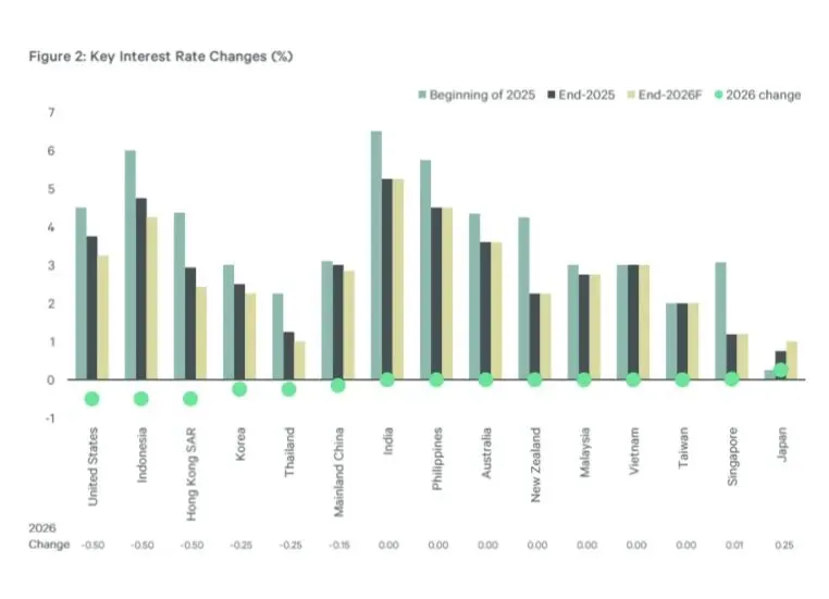虽然许多亚太市场在2025年继续降息,但大多数市场都快走到降息周期的尽头了,预计2026年的降息空间非常有限甚至完全没有。