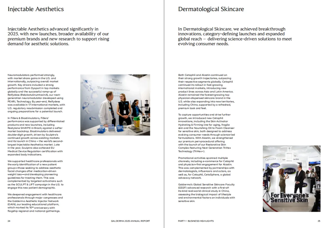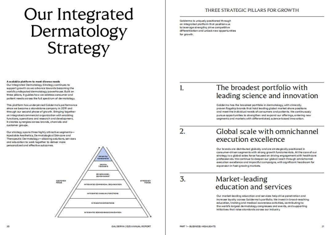 它当然仍然是全球医美领域最重要的公司之一,但2025年的财报更清楚地显示,高德美已经不满足于“医美龙头”这个定位,而是在向一个覆盖注射美学、皮肤学护肤、治疗性皮肤科三大板块的综合皮肤学平台加速推进。