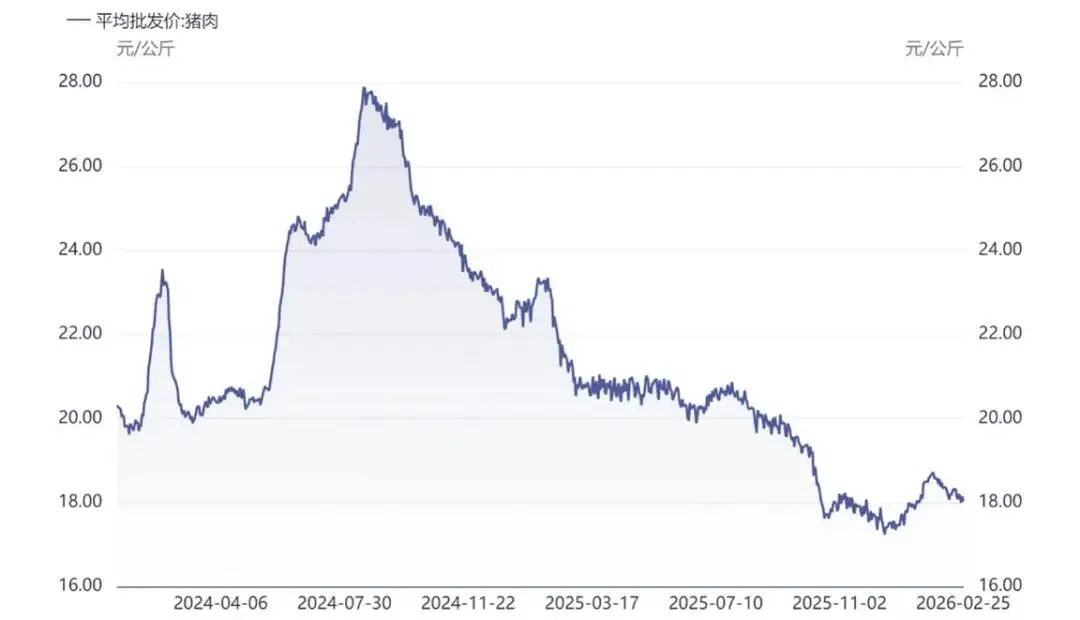 猪肉价格是影响中国CPI的最重要单一品种,其在CPI篮子中的权重虽随基期轮换有所下降,但价格波动幅度大,对CPI影响显著。2025年,猪肉价格呈现“前高后低、总体企稳”的走势。年初,受2024年底能繁母猪存栏下降传导影响,生猪出栏增速放缓,猪肉价格阶段性回升;年中,随着前期补栏生猪集中出栏,供应压力再现,价格回落;年末,在腌腊需求拉动和供应调节作用下,价格再度企稳。全年来看,猪肉价格同比涨幅较2024年明显收窄,对CPI的拉动作用减弱。饲料市场网的分析指出,2025年玉米、豆粕等主要饲料原料价格整体呈回落态势,一定程度上缓解了养殖户的亏损压力,支撑部分中小养殖户保持正常养殖节奏,避免产能过度去化。这一成本端改善意味着,即使猪价低位运行,养殖端也有一定承受能力,产能出清速度可能慢于预期,猪价回升空间受到制约。展望2026-2027年,生猪产业将进入“产能缓慢去化、价格触底回升”的转型周期。2026年价格走势预计呈现“前低后高”态势,上半年受2025年四季度能繁母猪存栏仍处于合理区间以上影响,生猪出栏量保持较高水平,猪价维持低位震荡;下半年随着能繁母猪存栏持续下行的传导效应显现,供需格局改善,猪价进入回升通道。2027年,若产能去化充分、需求恢复配合,猪肉价格有望实现更为持续的回升,成为推动食品CPI上涨的重要力量。6.1.2 鲜菜价格:受天气和季节性因素影响波动较大,2025年2月同比下降12.6%