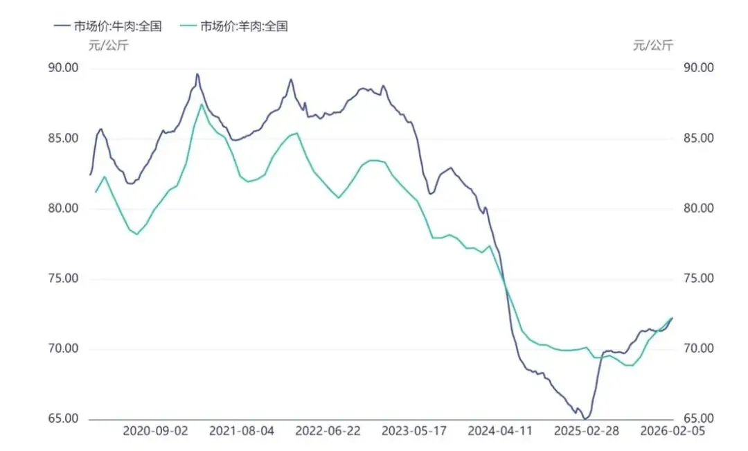 鲜菜价格是CPI波动中季节性最强、短期波动最大的品类之一。2025年2月,鲜菜价格同比下降12.6%,成为拖累食品CPI的重要因素。这一大幅回落主要源于2024年同期受春节因素和极端天气影响,鲜菜价格异常高企,形成了较高的比较基数;同时,2025年初气候条件有利,蔬菜供应充足,价格本身也处于相对低位。鲜菜价格的短期剧烈波动对CPI分析带来挑战——单月的大幅涨跌可能扭曲对整体价格走势的判断,因此需要结合多个月份数据或采用移动平均方法进行处理。从全年走势看,2025年鲜菜价格总体低于上年,对CPI形成持续拖累;2026-2027年,鲜菜价格走势将主要取决于气候条件,若出现极端天气事件,可能成为CPI上行风险来源。6.1.3 牛羊肉价格:2025年2月同比分别下降13.3%、6.6%