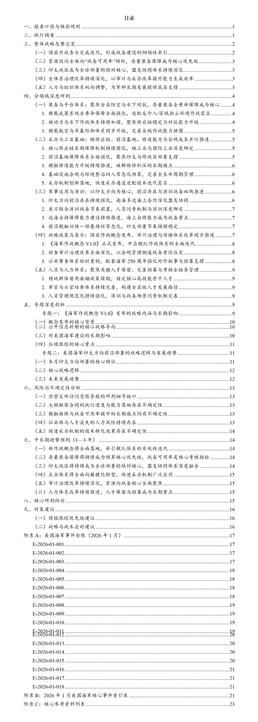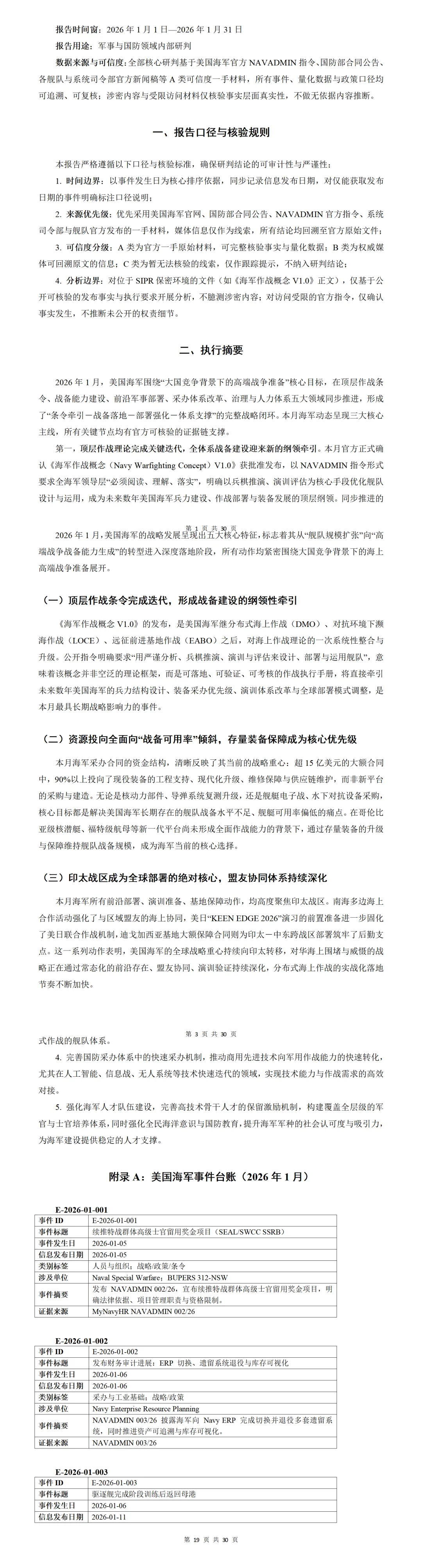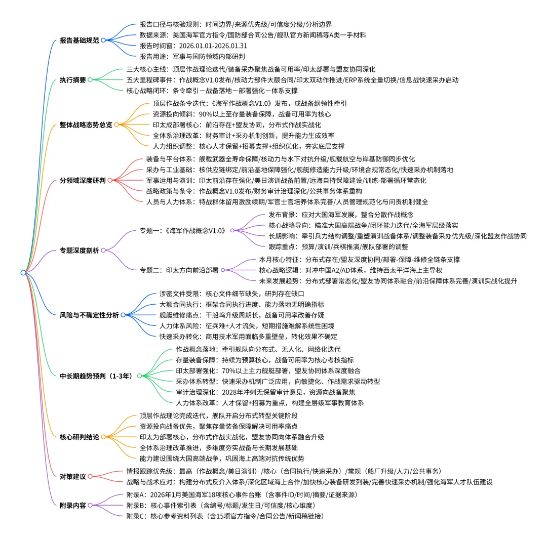 报告通过NAVADMIN指令、国防部合同公告、舰队官方新闻稿等原始材料逐条核验,并建立事件编号台账,使每一条结论都能回溯到具体来源。对于需要长期跟踪美国海军战略与能力变化的研究者而言,这种结构化方法能够将碎片化信息转化为可持续更新的战略数据库。