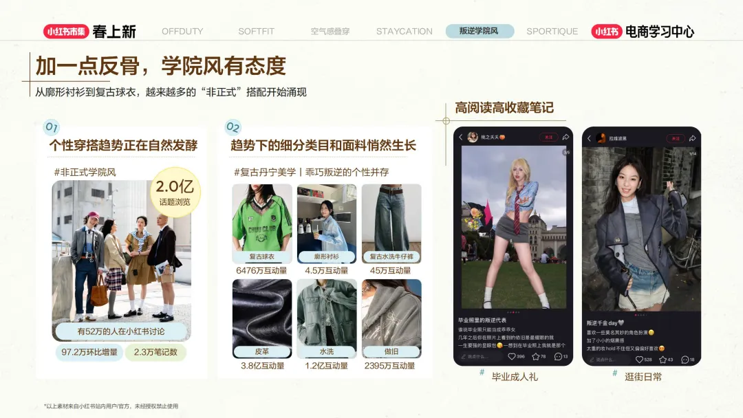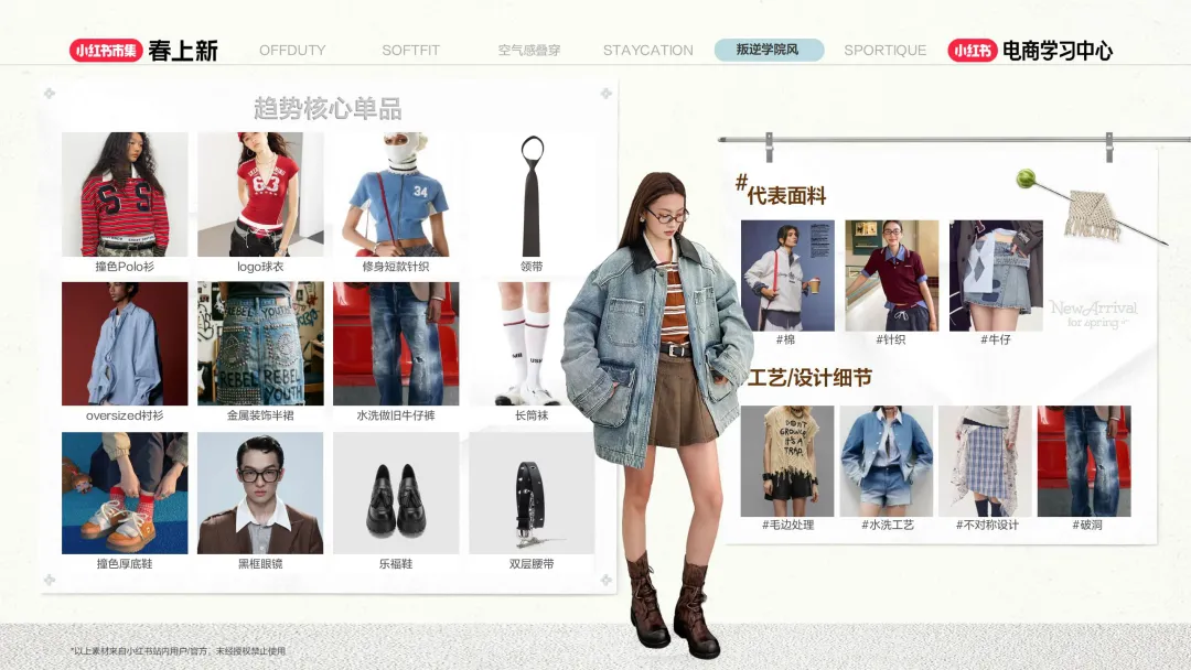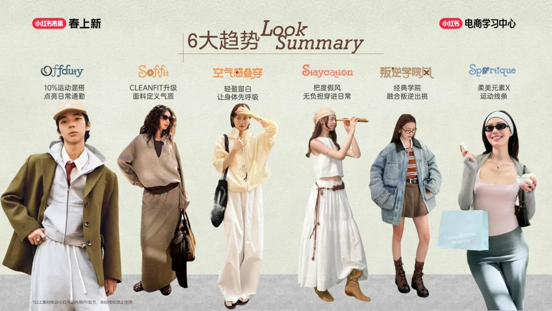 ,分别为 Offduty、Softfit、空气感叠穿、Staycation、叛逆学院风、Sportique,趋势挖掘结合