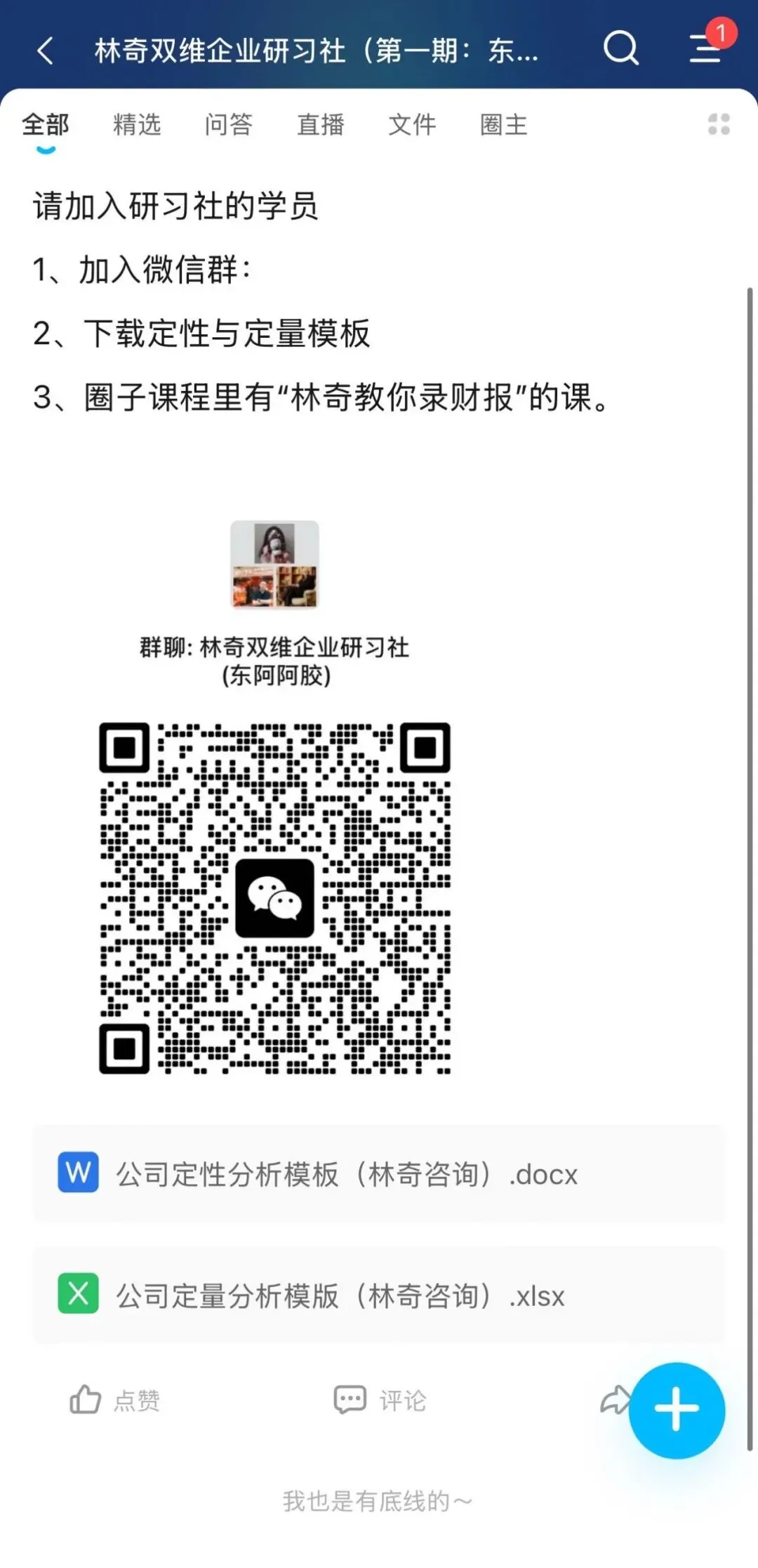 加入后可获得的权益:1、定性定量模版;2、加入研习社微信群针对定性定量的答疑解惑;3、林奇的六节课程;4、林奇和潇湘做的该公司的定性定量报告;5、两场专场直播:一场答疑,一场报告。