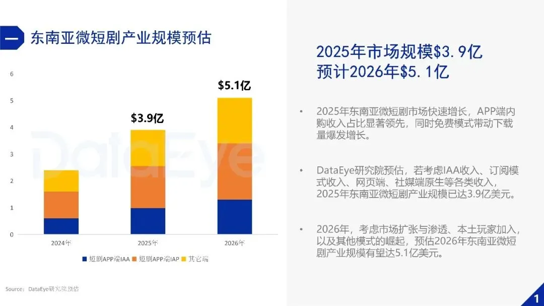 DataEye研究院预估,若考虑IAA收入、订阅模式收入、网页端、社媒端原生等各类收入,2025年东南亚微短剧产业规模已达3.9亿美元。
