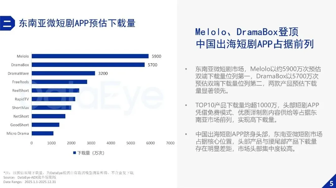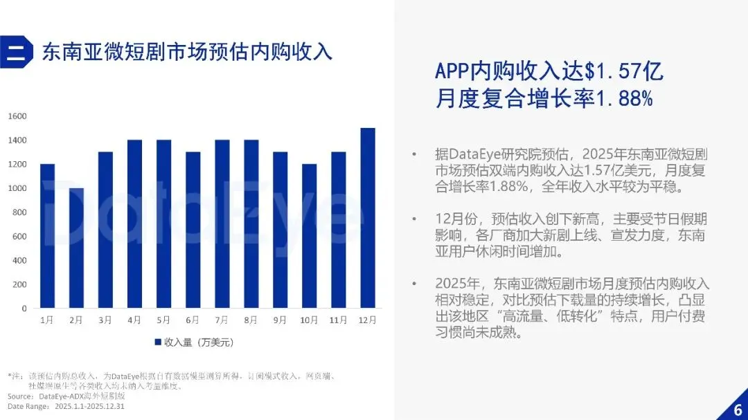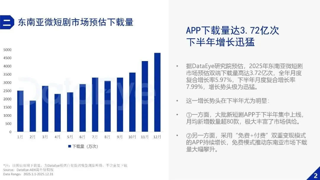 2025年东南亚微短剧市场快速增长,APP端内购收入占比显著领先,同时免费模式带动下载量爆发增长。
