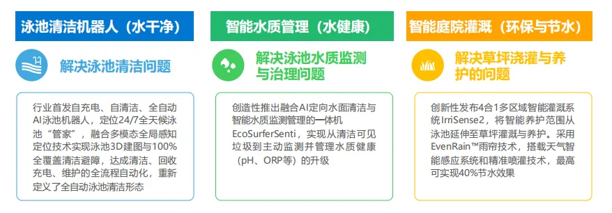 "感知-理解-决策-自适应”的智能闭环,使机器人能在实时环境中自主判断与调整,实现从无差别清洁到按需清洁。同时推出4合1多区域智能灌溉系统IrriSense2,革新传统庭院灌溉形式。2)全渠道布局与市场渗透力。在亚马逊无线泳池机器人品类市占率持续领先,部分型号市占率超过50%,并成功入驻欧美主流零售及专业泳池渠道。2025年获全球泳池及健康设备领导者Fluidra战略投资并达成深度合作,同期与全球泳池设备零售领域头部企业POOLCORP达成战略合作,突破传统专业泳池渠道壁垒,加速全球全渠道布局。3)品牌全球化能力。坚持本地化品牌建设与一线用户调研,深度融入欧美市场,品牌知名度位居行业前列,成为消费者信赖的智能庭院品牌。