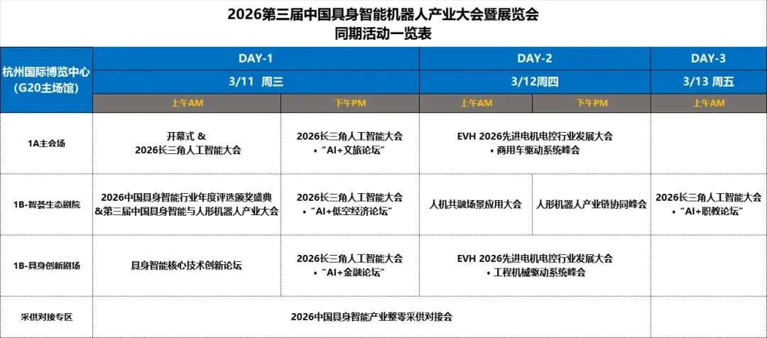 2026第三届中国具身智能机器人产业大会暨展览会,将于3月11日至13日在杭州国际博览中心(G20主场馆)举办。