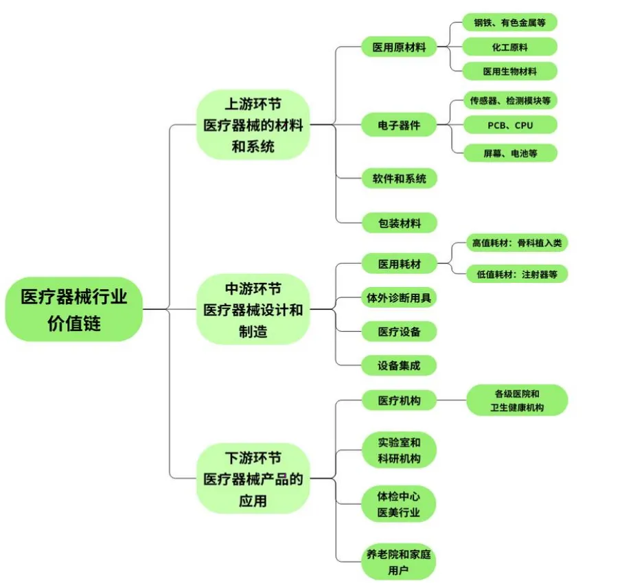 医疗器械行业是多学科交叉的战略性新兴产业,兼具高技术、高投入、高壁垒、弱周期性的鲜明特征,覆盖上游原材料 / 技术研发、中游设计制造、下游医疗场景应用的完整价值链,核心分为高值耗材、低值耗材、医疗设备、体外诊断(IVD)四大品类。