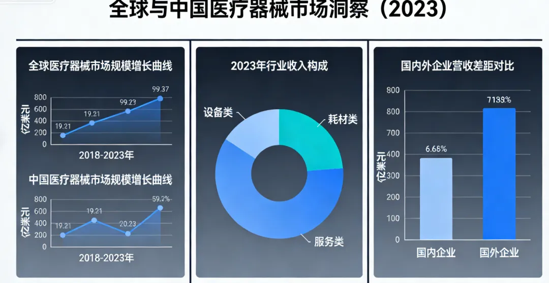 从市场规模来看,全球医疗器械市场 2023 年达 5825 亿美元,2015-2023 年年均复合增长率 6.37%;中国市场同期从 3038 亿元增长至 10358 亿元,占全球 25% 份额,成为全球第二大市场。但本土企业与国际龙头仍有差距,全球市值 200 亿美元以上的器械企业中,中国仅迈瑞医疗 1 家,2023 年 A 股 126 家上市器械企业总营收仅 2273 亿元。