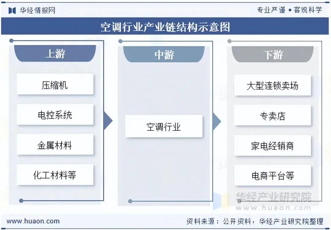 空调行业产业链上游包括核心零部件、主要原材料与技术软件等,其中核心零部件包括压缩机、电机、换热器、电控系统等,主要原材料包括金属材料与化工材料,其中化工材料为制冷剂(如R32、R410A)、塑料颗粒(用于外壳、风叶)、各种涂料和保温材料。产业链中游为空调整机研发、设计与制造。下游渠道主要包括大型连锁卖场、专卖店、家电经销商与电商平台,终端用户包括个人/家庭、工业/商用、公共机构等。