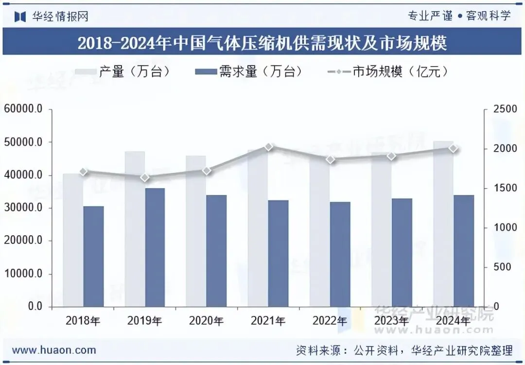 空调使用的压缩机属于气体压缩机,主要用于压缩制冷剂气体(如氟利昂、R410a等),而非直接压缩空气。据统计,近年来我国气体压缩机行业供需稳定,市场规模整体增长。据统计,截至2024年我国气体压缩机行业产量为50466.2万台,需求量为33979万台,市场规模为2013.3亿元。