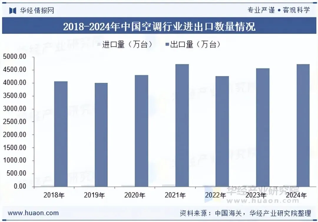 进出口来看,政策的内需拉动效应通过规模经济降低了单位成本,增强了出口价格竞争力,形成“内需促创新-产能提质效-外需拓市场”的良性循环。据统计,截至2024年我国空调进口量为65.44万台,出口量为4722.84万台。
