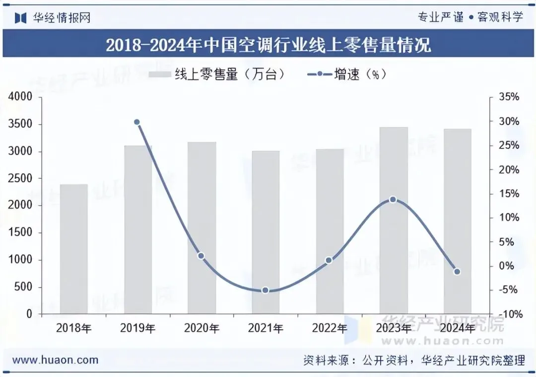 2012年8月,京东CEO刘强东先生发文称“京东大家电将实行三年内零毛利”,且“京东所有大家电将比国美、苏宁连锁店便宜10%以上”,家电行业渠道价格战全面打响。在此之后,中国空调电商渠道发展显著提速,据统计,截至2024年我国空调行业线上零售量为3419万台。